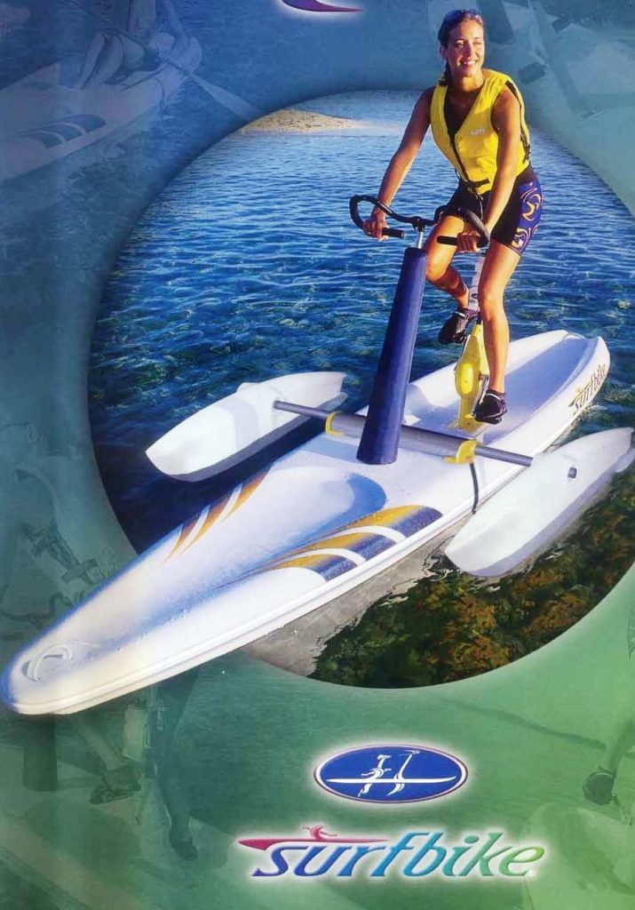 The Surfbike looks like a surfboard on which a steering mechanism ( handlebars, steering column and rudder ) and a pedal unit with a propeller have been added. Surfbike has three distinctive components ; a board, a steering mechanism and a propulsion system.